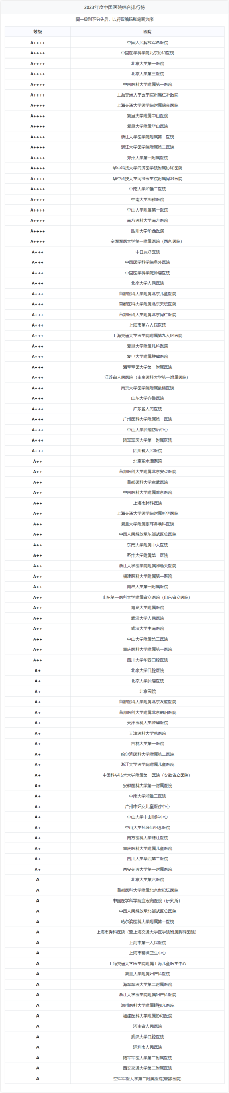 今年復(fù)旦版《中國(guó)醫(yī)院綜合排行榜》在各大醫(yī)院名次的“表達(dá)”方法有了重大改變,百家醫(yī)院由原來的第1至第100名順序排名,改變?yōu)椴恢苯优琶?。分為A + + + +、A + + + 、A + + 、A + 和A 五個(gè)等級(jí),每一等級(jí)20家醫(yī)院,A + + + +為最高等級(jí)。