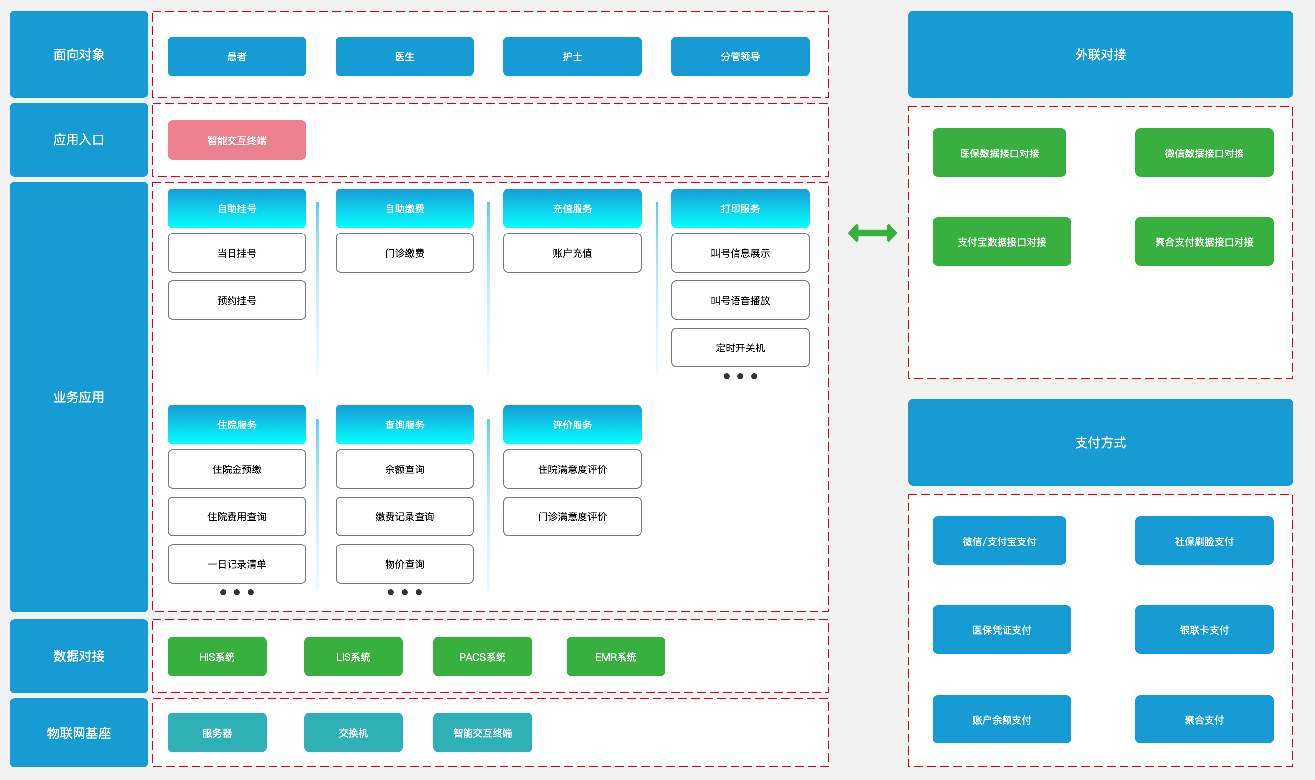 銀醫(yī)通系統(tǒng)的組成主要由智能交互終端和自助服務(wù)管理系統(tǒng)兩部分組成,主要功能包含:自助建檔、當(dāng)日掛號(hào)、預(yù)約掛號(hào)、預(yù)約取號(hào)、預(yù)約退費(fèi);門診繳費(fèi)、檢驗(yàn)繳費(fèi)、檢查繳費(fèi)、藥房繳費(fèi);檢驗(yàn)檢查報(bào)告打印、建檔憑證打印、賬戶余額充值、住院金預(yù)繳等功能
